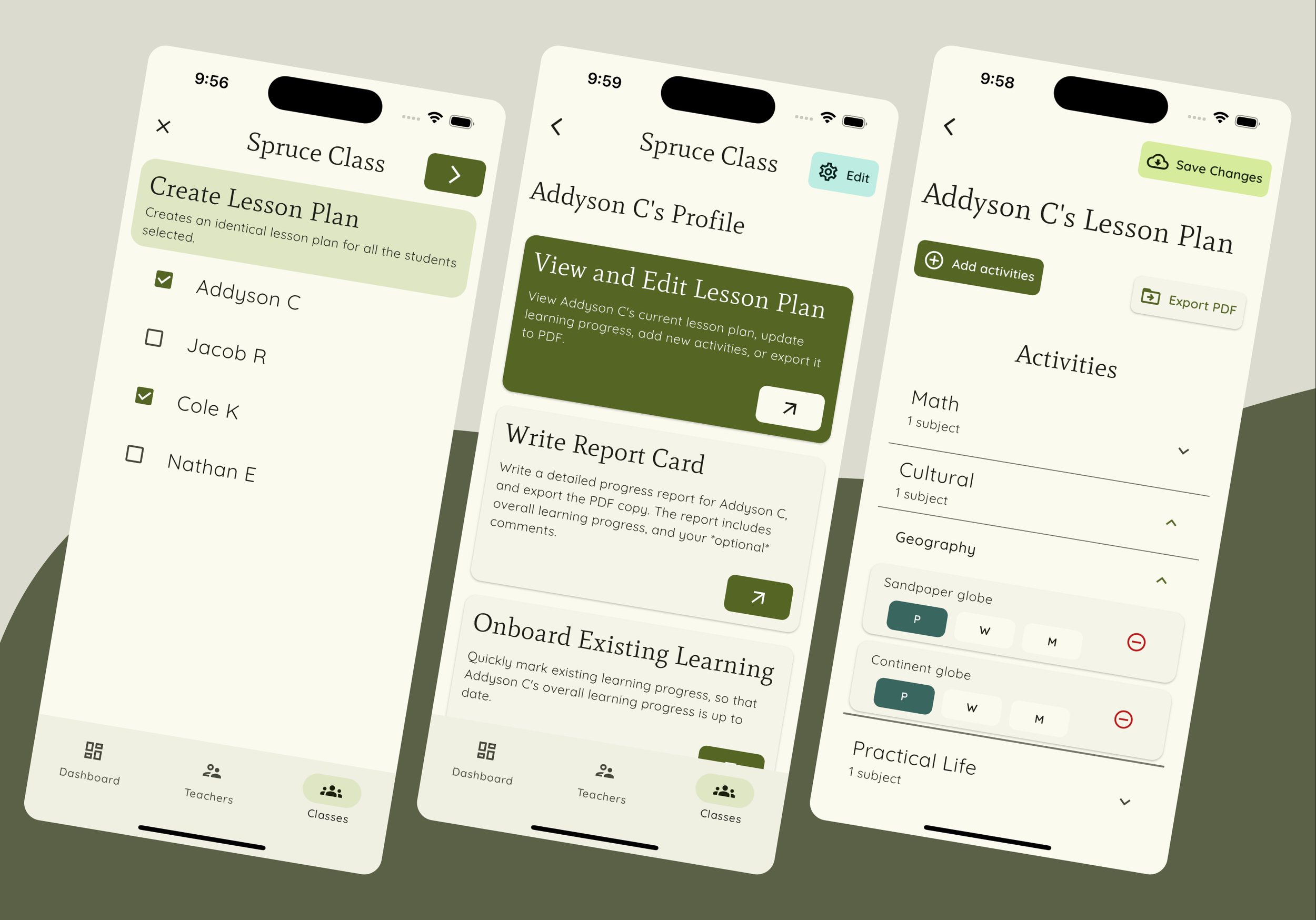 All the same functionality the teachers have is available to you: Monitoring individual growth, recording learning progress, modifying lesson plans, and more